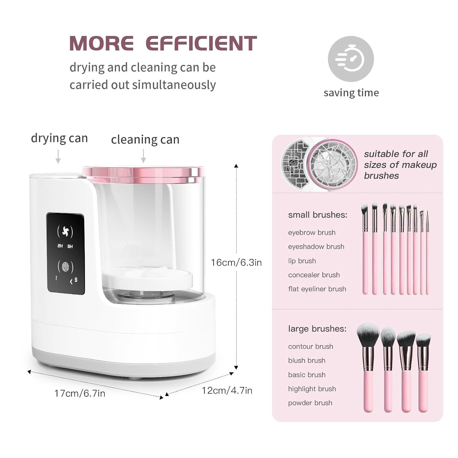 - 【High Efficient Drying】The makeup brush cleaning machine has a makeup brush dryer and brush holder, which can quickly get clean brushes. Say goodbye to the traditional natural air drying method of one or two days, saving you time. The design of normal temperature wind can gently protect the brush fibers, avoid damaging the bristles, maintain the texture and shape of the makeup brush, and extend its service life.
