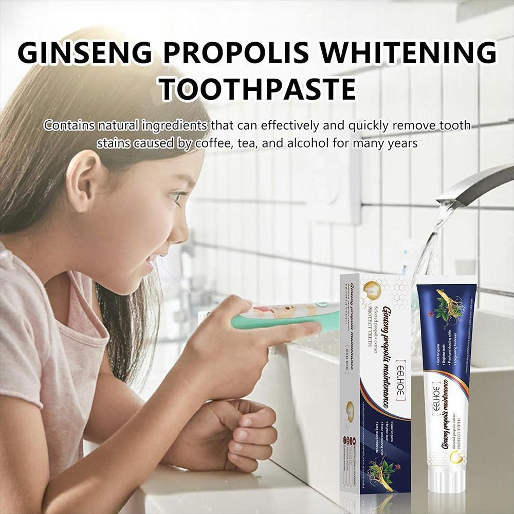 Teeth whiten toothpaste employs a gentle, clean ginseng propolis composition to gently remove the plaques between teeth, treat oral health issues, and support the gums. It long-term maintains a pleasant and clean mouth.