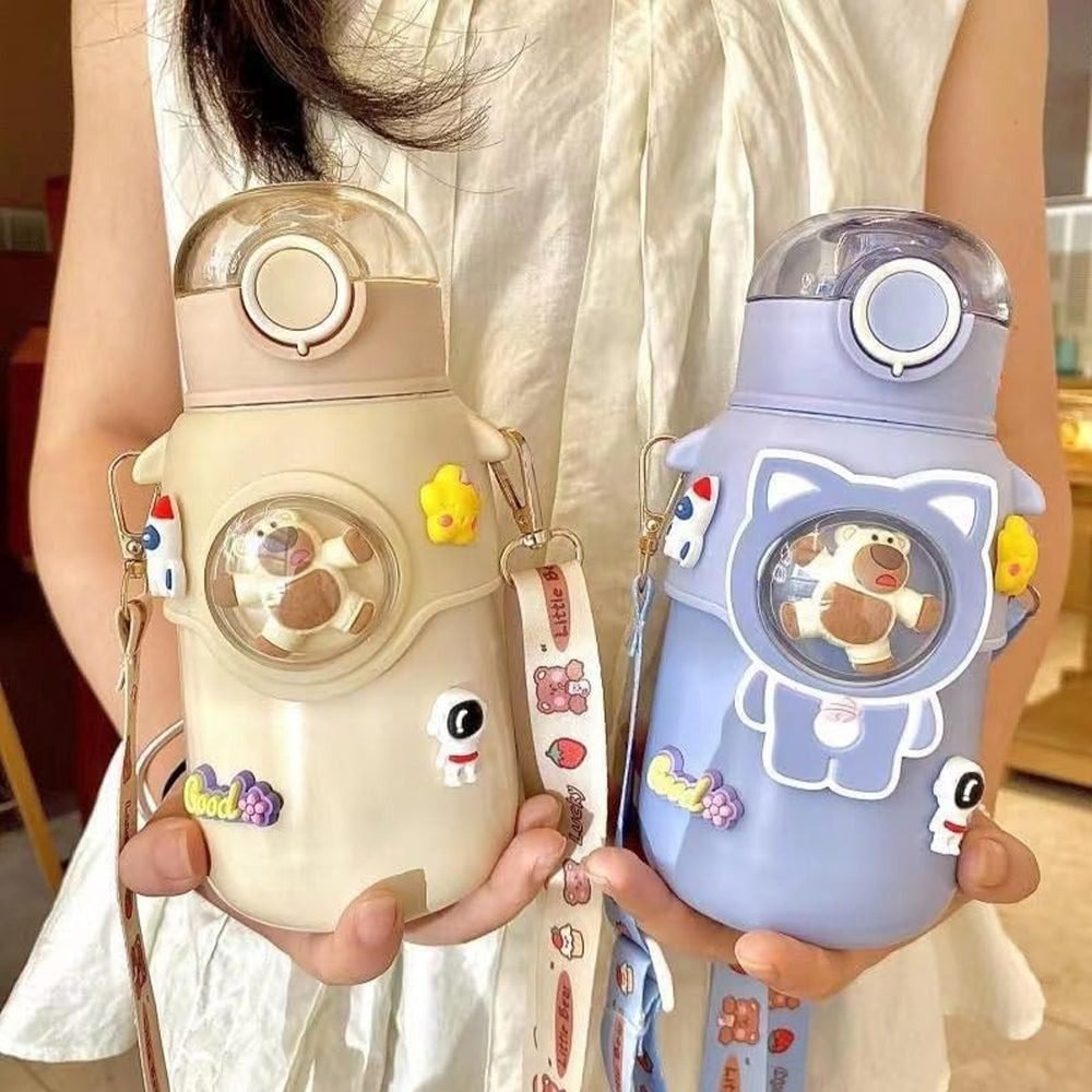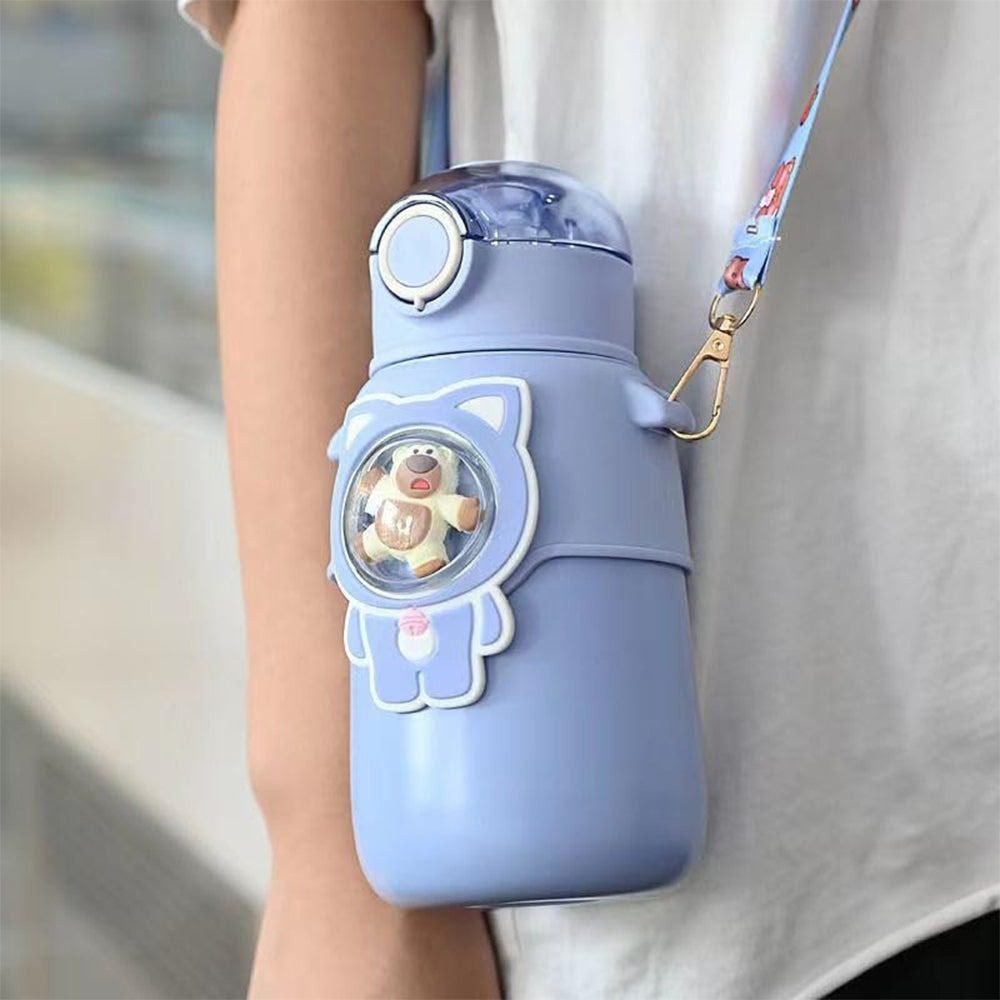 - Cute water bottle with silicone straw, perfect for kids; adjustable shoulder strap for easy portability; built-in silicone seal in the lid to prevent water leakage