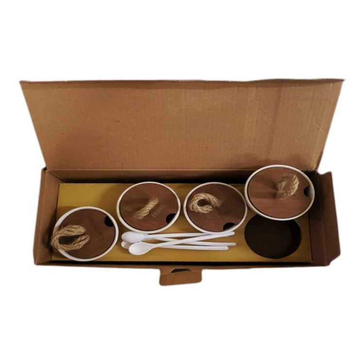 Wholesale 4-Piece Spice Set With Wooden Stand and small spoons.