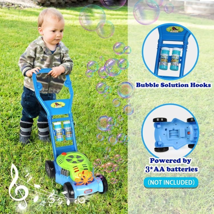 - This is a push toy with bright colored Bubble stick inside a semi-round base that pop up bubble and make music as the toy is pushed. Bubble mowers may particularly appeal to kids who have just learned to walk well and to run. Most parents note that the thrill of walking and running is very entertaining for kids aged two to four. The mower is lightweight too, and can be easily packed for trips to the park where a child can be occupied for a quite a while as they ?mow the grass.