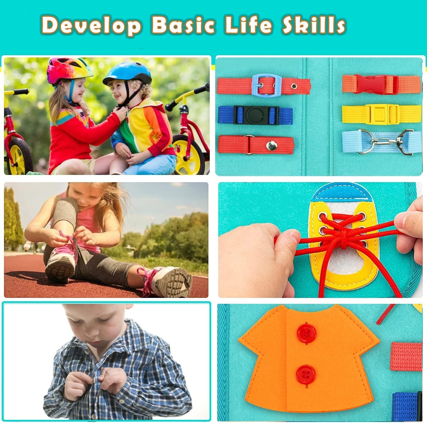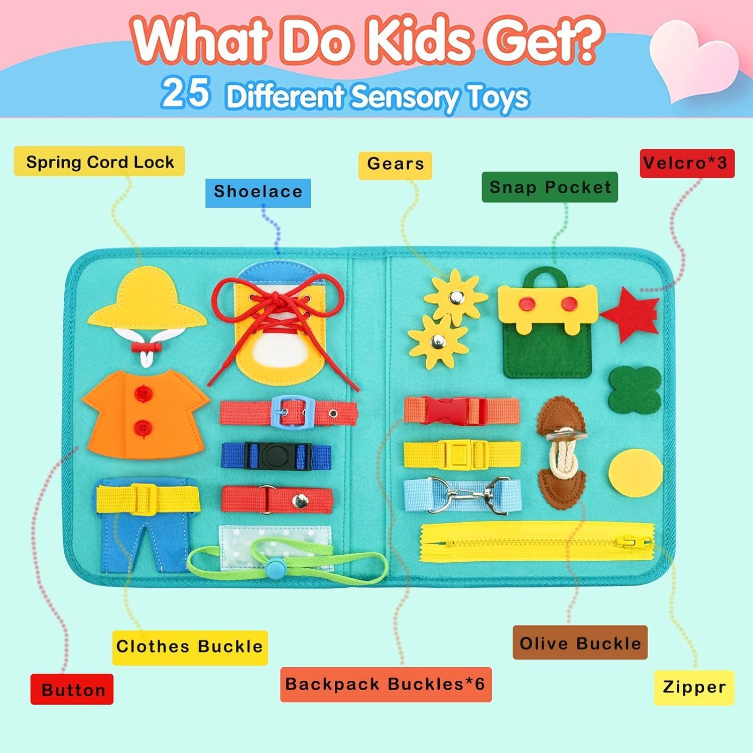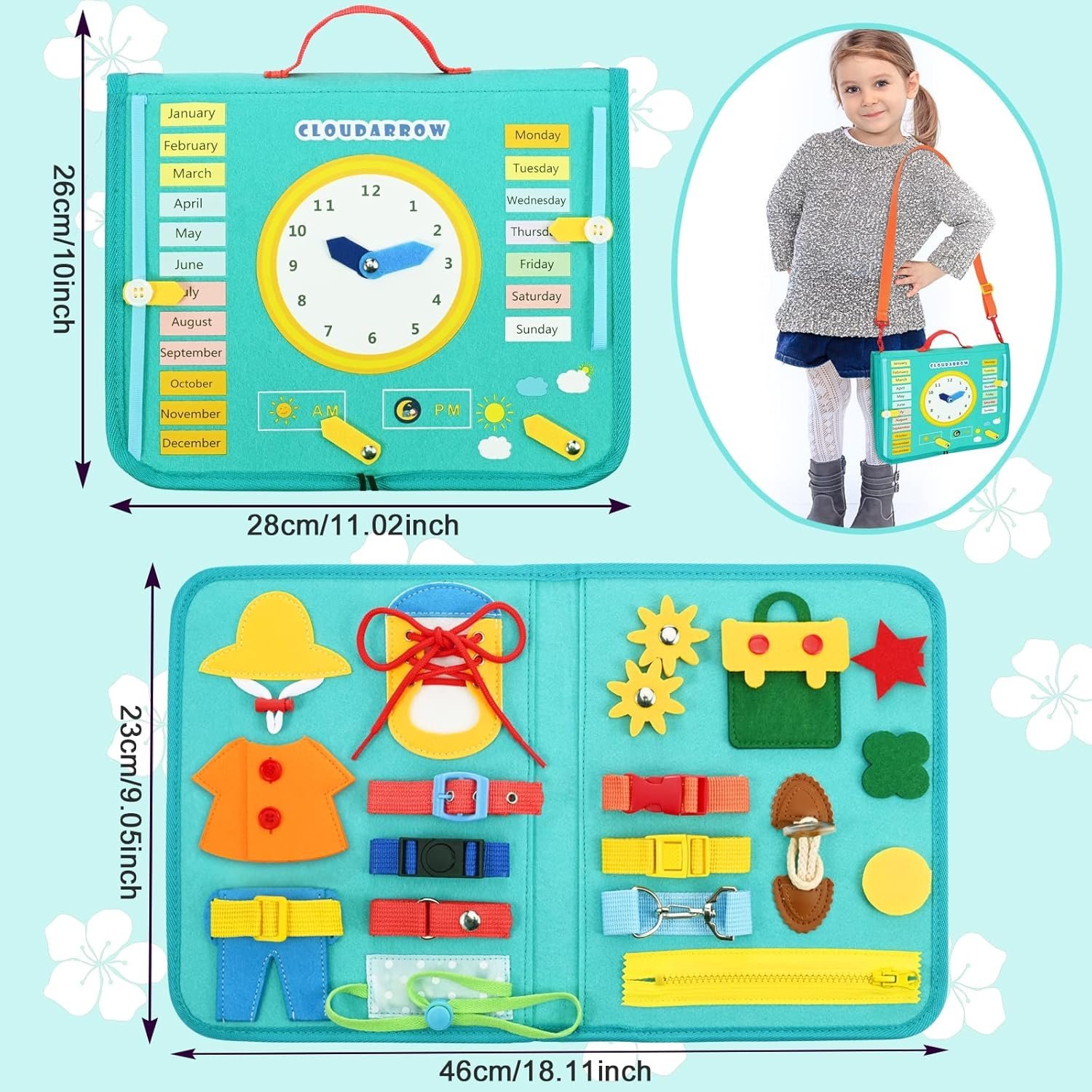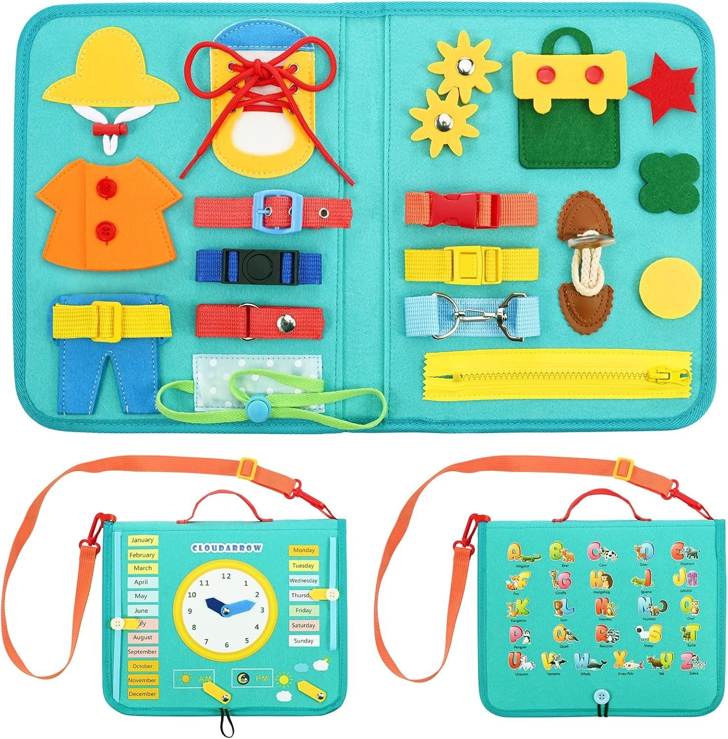 - 【💝26-IN-1 MONTESSORI BUSY BOARD】Cloudarrow activity board helps kids learn basic life skills through play. It features 26 Montessori toddler activities, including shoelaces, buttons, belt buckles, zippers, alphabet, gears, clocks, calendars, and more. Variety learning activities in bright colors develop children’s cognitive skills, attention span and learning ability.