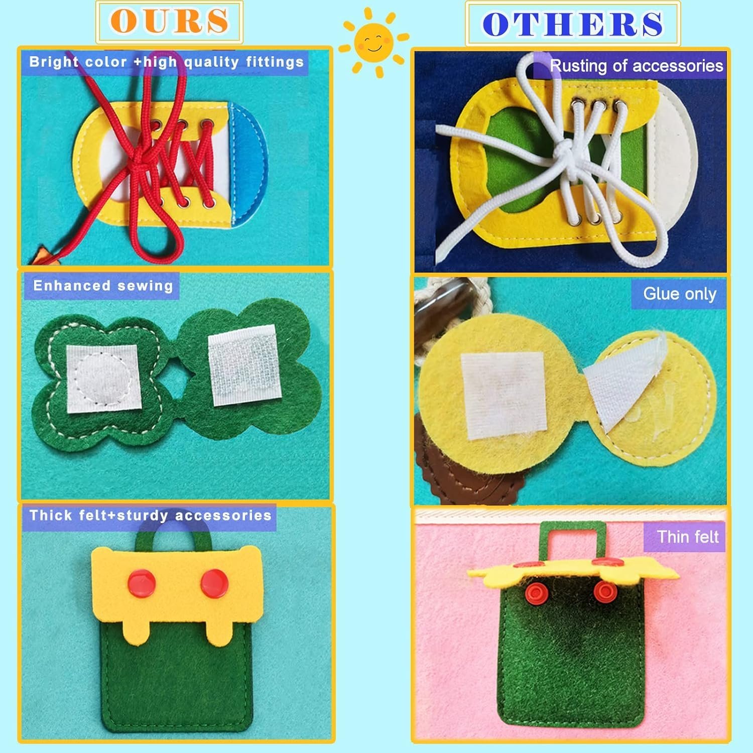 - 【💝SAFE EDUCATIONAL TOY-Soft, Durable, and Safe】Our Montessori busy book is made primarily of toxic-free soft fabrics and felt, which is soft, flexible, but at the same time, very durable! All of the parts are securely fixed to the board with no hard corners. Now, the 2nd version is available which is super sturdy and attractive.