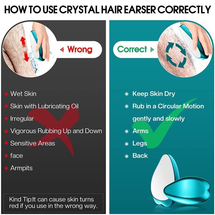- [How to Correctly Use] – It is very easy to use this hair eraser. ????But the wrong way to use can cause the skin turns red, rash or razor itching. What is the Correct Way to Use? 1. Please Keep the skin dry. 2. Please gently and slowly rub in a circular motion to remove the body hair. ????What is the Wrong Way to Use? 1.The skin is wet or use the lotion, ?lubricant on the skin before removing the body hair. 2. To rub too hard or irregularly on the skin.
