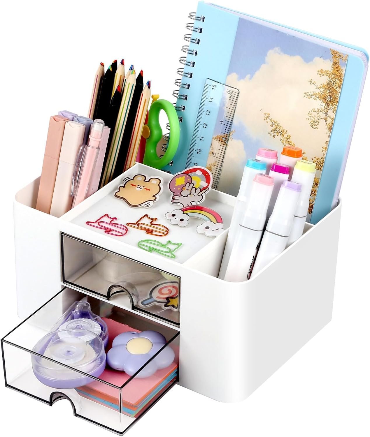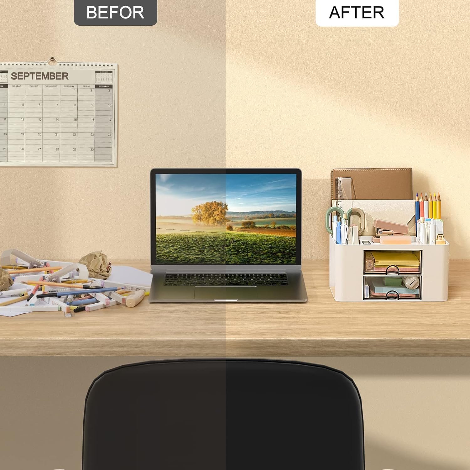 Desk Organiser, Multifunctional Office Organiser with Drawer and Pen Holder, Pen Holder Organiser, Plastic Table Organiser, 5 Compartments for Pens, Stapler, Sticky Notes, Notebook