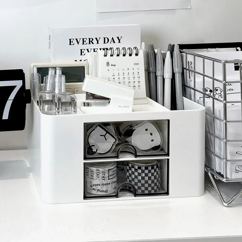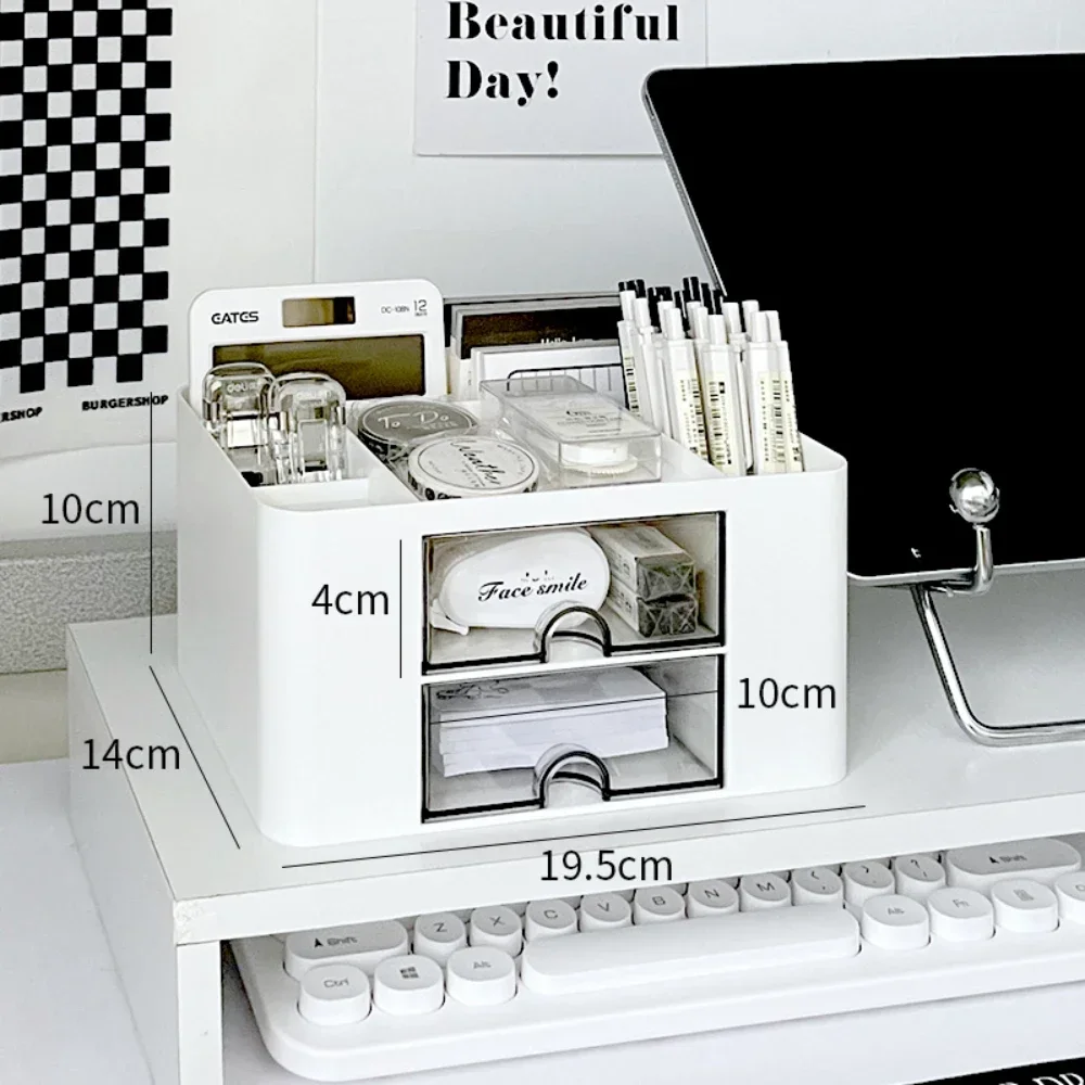 • Multi-purpose office organiser: this desk organiser has a large compartment for notebooks and files; 5 compartments for pencils, pens, scissors, rulers, highlighters, markers, glue; a platform for a stapler, eraser, tape, glasses; and 2 transparent drawers for stickers, paper clips, drawing pins. This desk organiser offers you the opportunity to store your office utensils and makes storage easy