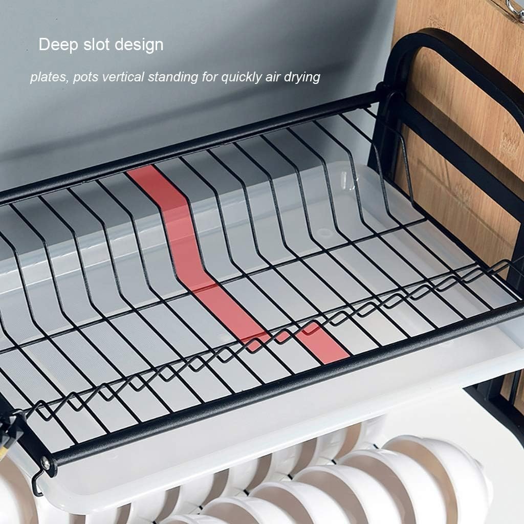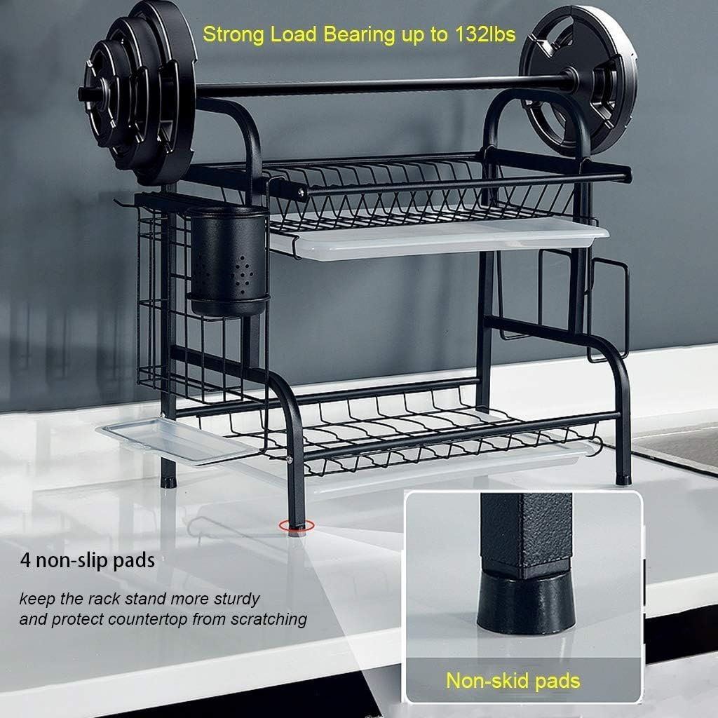 Dish Drying Rack 2 Tier Dish Drying Rack, 304 Stainless Steel Kitchen Organizer with Drainboard/Cutlery Holders, Black