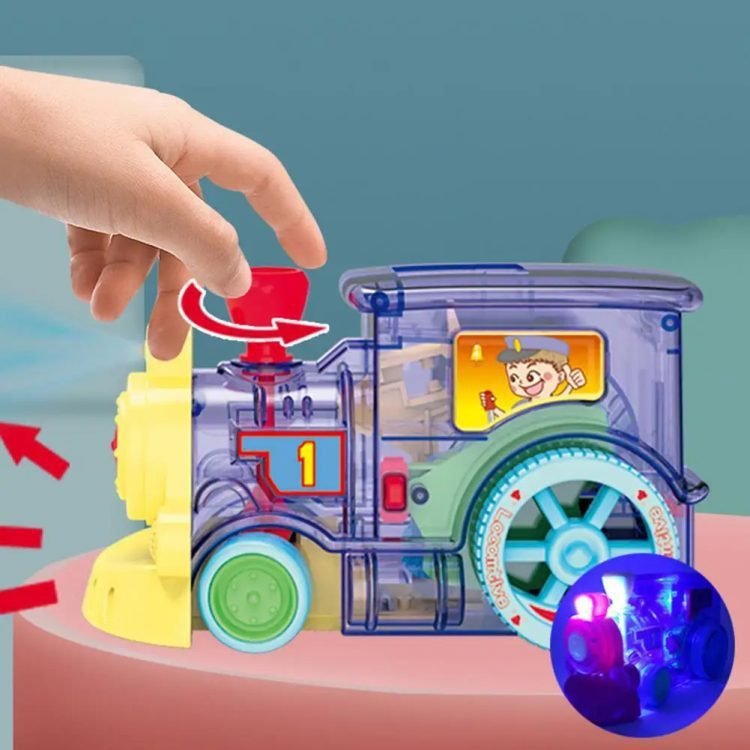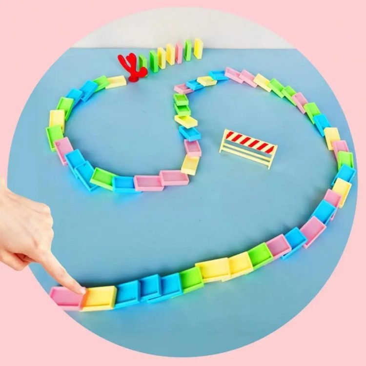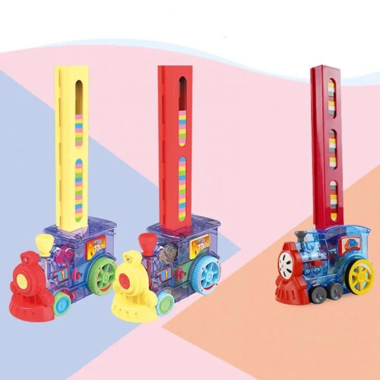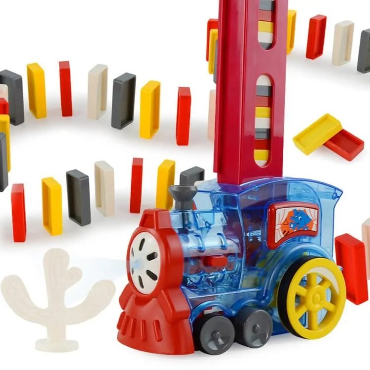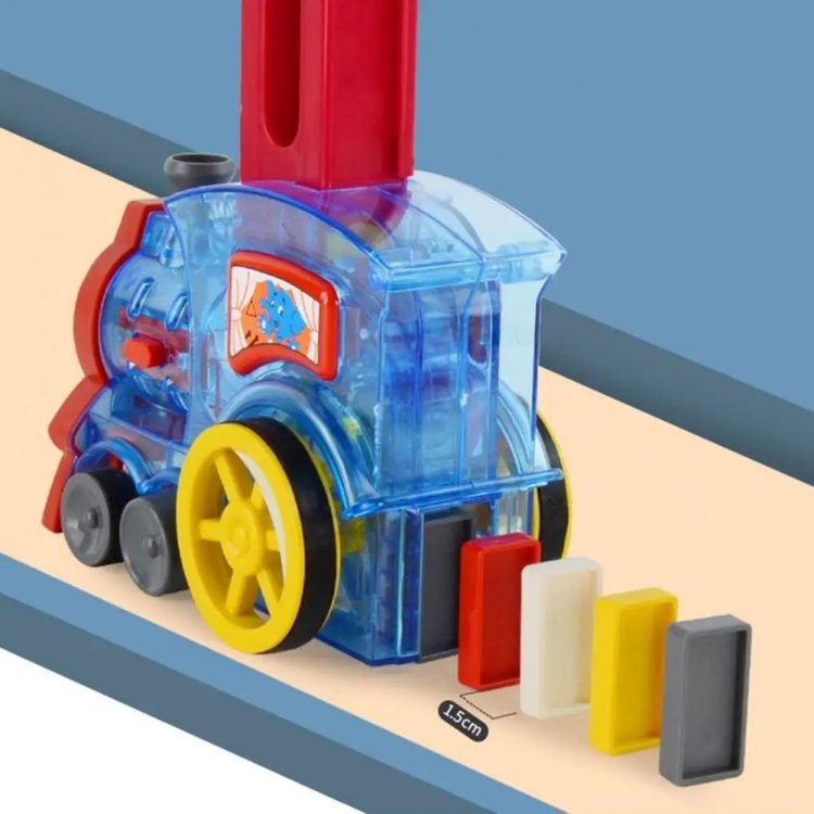 As the train moves forward, it will deposit the standing dominoes in a row.