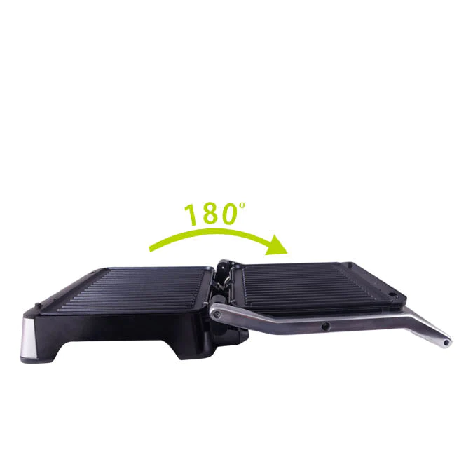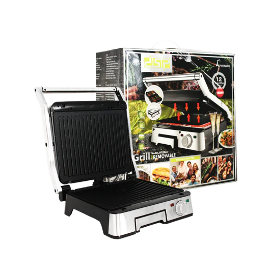 Electric barbecue grill 1800W DSP KB1045 – Voltage: 220-240V – Frequency: 50-60Hz – Power: 1800W – Plate size: 30*23cm – Adjustable temperature at 5 levels – Open at 90 and 180 degrees – Power cable: 1 Meter – Handle at cool touch – Non-stick coating plate – Lights on and ready – Stainless steel lid – Drip tray – Removable gill plate
