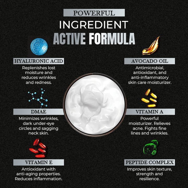 - Premium Formula – Contains premium ingredients like Hyaluronic Acid, Vitamins A & E, Peptides, Collagen, and more.