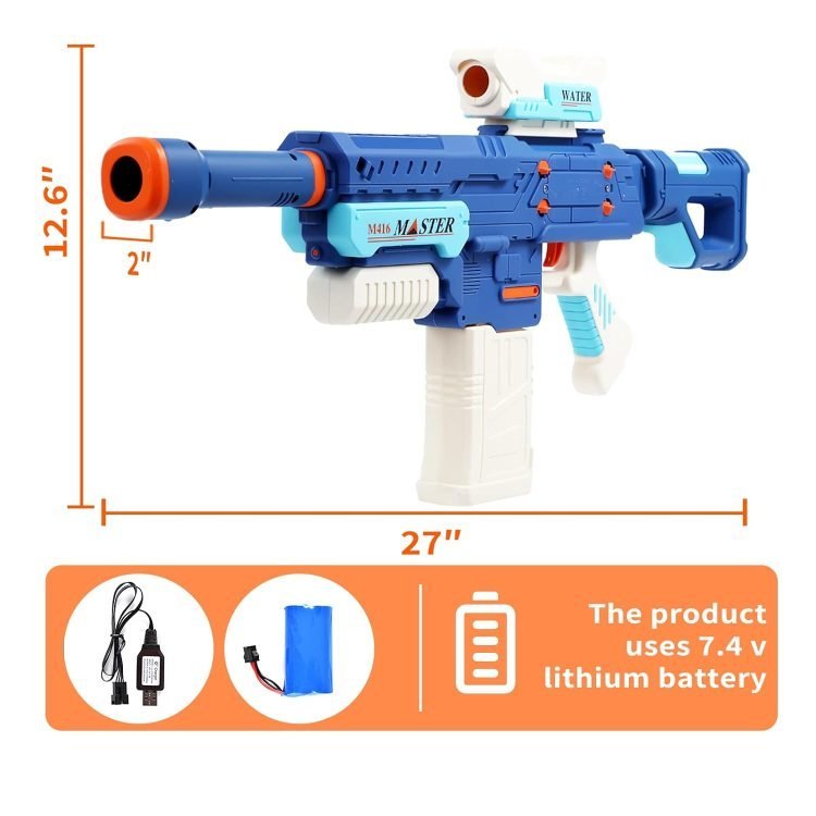 The electric super soaker has a rechargeable 1200mAh battery that can be charged with any USB port device. It offers a long battery life for endless fun and has a waterproof rubber band battery window. Avoid fully submerging the water Soaker Pistol to prevent damage to the electrical components.