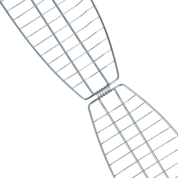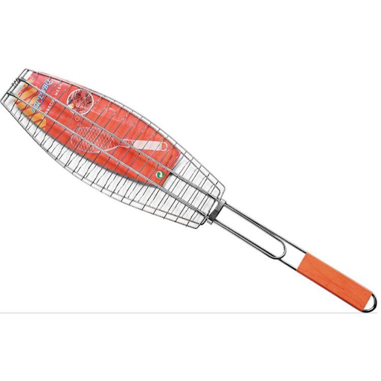 Fish Barbeque Grill, Chromium Plated Iron, Folding Portable BBQ Grill for Fish, Vegetables, Shrimp with Removable Heat Resistant Wooden Handle
