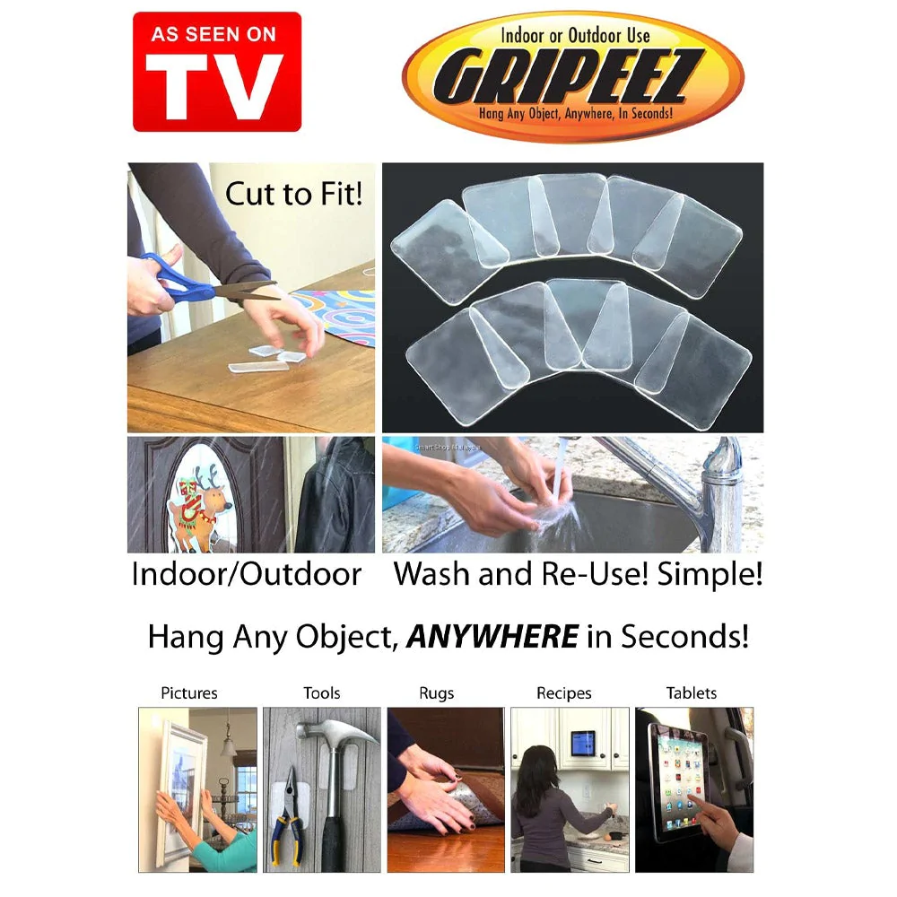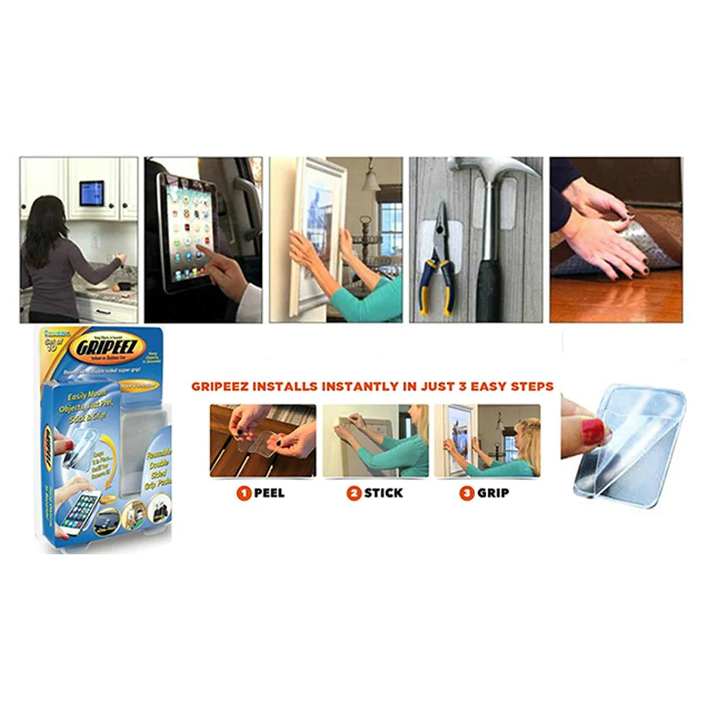 Revolutionary gripping pad that lets you hang anything, anywhereRemovable so you can reposition objects with no damage to your wallSticks to plastic, glass, drywall, tile, wood, steel and many more surfacesPowerful & ultra tightNon-slipHolds up to 2.2 Kg