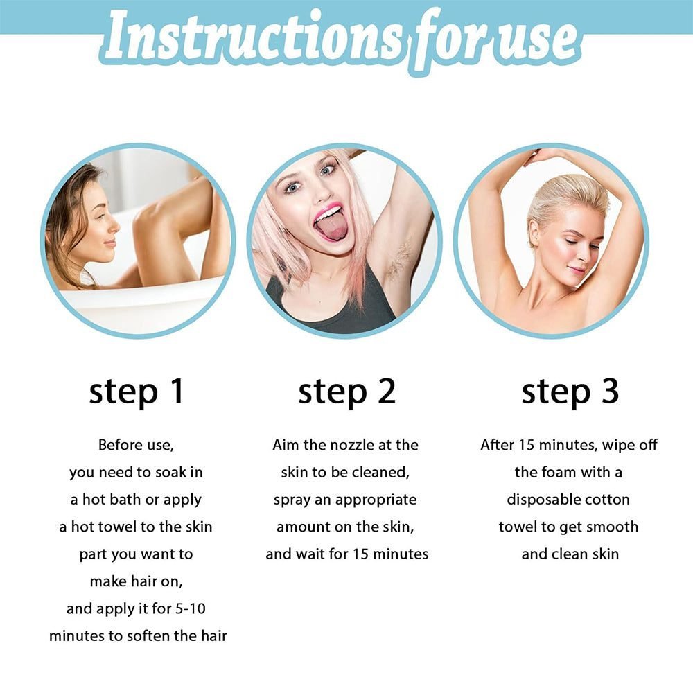- Fast hair removal: Specially formulated to effectively remove unwanted hair, this spray provides a practical and painless solution. Simply apply, wait and wipe off for incredibly smooth and tactile skin. With its gentle formula, our hair removal spray is suitable for all sensitive areas, making it the ideal choice for removing hair on the face, arms, legs and more.