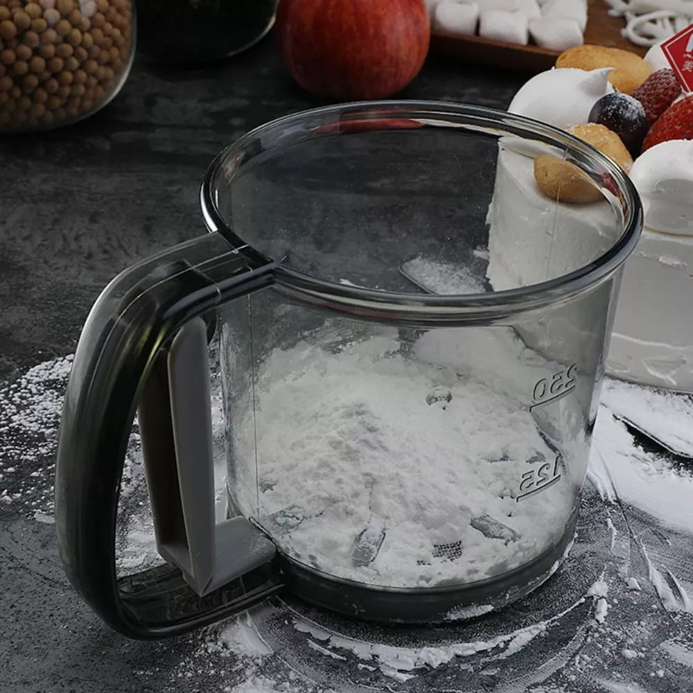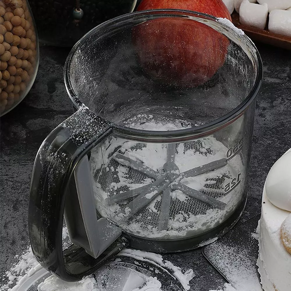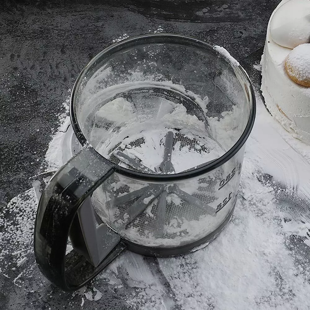 Note: The double-layer flour sieve is mainly designed for users who need ultra-fine flour, cocoa powder and powdered sugar. Do not put too much flour in the cup to avoid clogging. blocked can gently tap the cup to unclog.