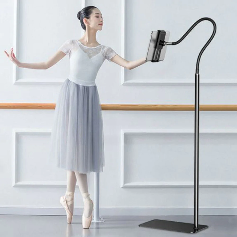 Heavy Duty Tablet/ Phone Floor Stand Flexible Gooseneck Stainless Steel Tablet Holder 115cm Max Height – Black