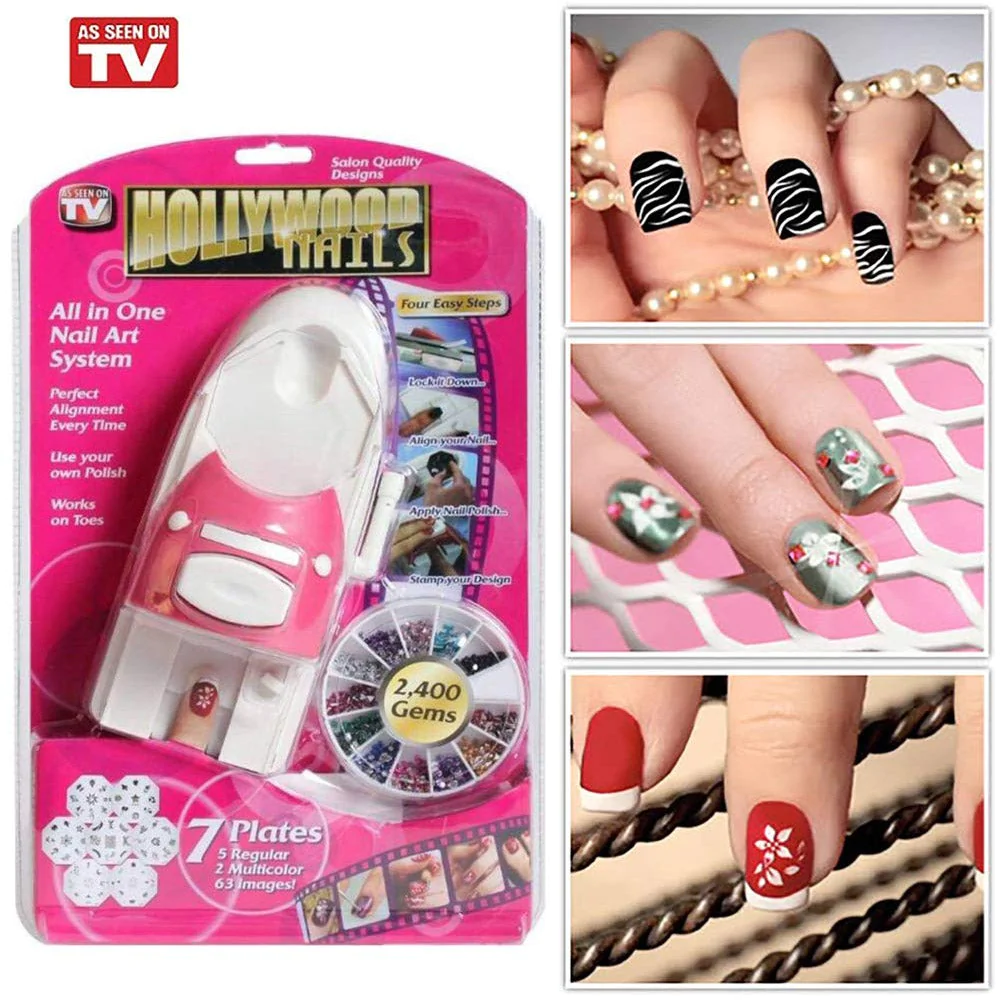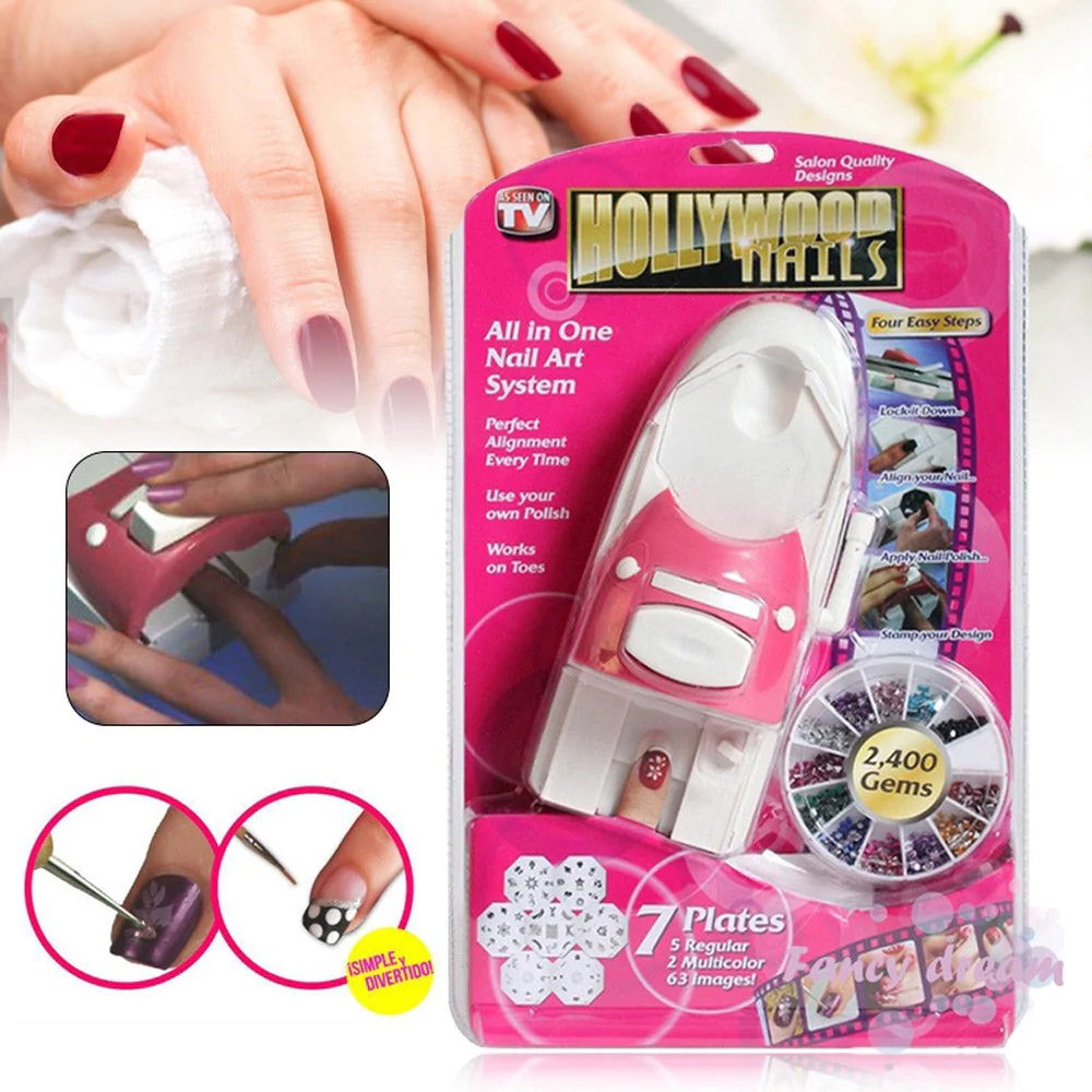 Easy, affordable, do-it-yourself nail designs. Create fun and trendy nail art at home with this simple, all-in-one design system. The supportive hand-steadying base holds your finger – or toe – in place while you paint your nail and stamp on the design of your choice, ensuring perfect alignment and salon-quality results every time. The kit includes seven plates with over 60 chic designs, a professional nail art tool, and 2400 rhinestones for that extra bit of sparkle and bling. Polish not included. Plastic/metal, 8”L x 3”W x 13 3⁄4”H.