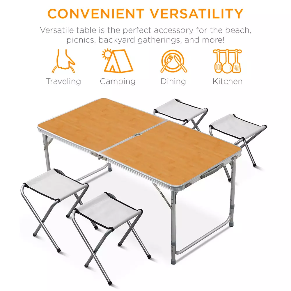 Introducing the newly designed high-quality kitchen dining set, ideal for outdoor and indoor use. This folding, portable picnic and camping table comes with 4 stools, making it perfect for a wide range of activities such as camping, picnics, BBQs, car boot sales, buffets, playgroups, parties, and more.