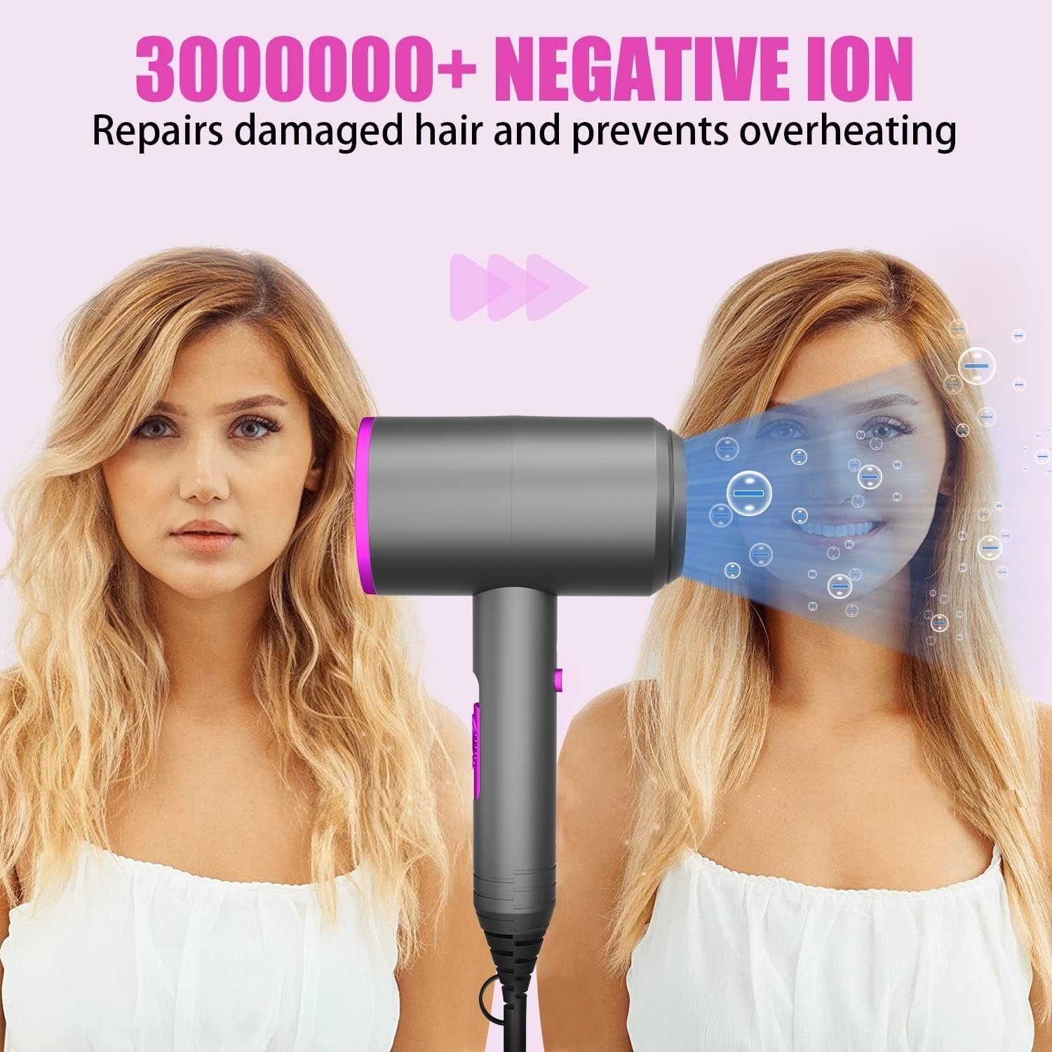 - Negative Ion Technology, 134?F Constant Temperature: Our ionic hair dryer with ionic technology releases millions of negative ions to to eliminate frizz and add shine when you are dry hair. In addition, the negative ionic hair dryer has constant temperature protection function, intelligent temperature control at 134?F to prevent overheating damage, good for hair care. Long-term use can improve the shine and softness of the hair, say goodbye to matted hair !