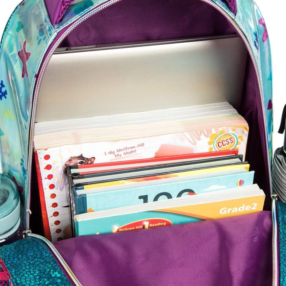 ?[Mermaid Backpack with Wheels Capacity]? 1 large main compartment with 1 laptop compartment; 2 front zipper pockets for iPad/A4 size; 2 mesh water bottle pockets; 1 special pencil case that can be hung on the backpack; 1 lunch bag with adjustable straps, which can be used as a shoulder bag or as a handbag. A patch pocket is also in the front pocket with many different spaces for easy access to pens and notebooks, keychains, etc.