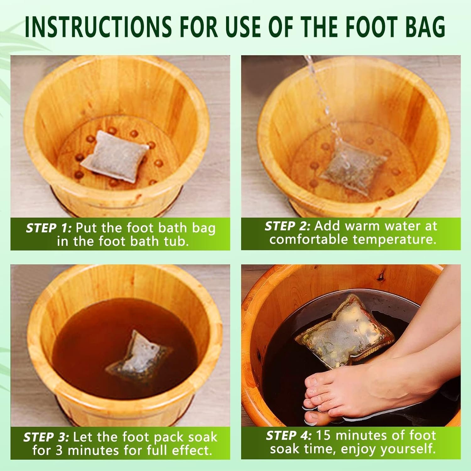 - Easy to Use: Put the wormwood foot bath bag into the basin, add boiling water to soak for one minute, add warm water to the appropriate temperature, soak your feet for 20-30 minutes, until the body sweats slightly.