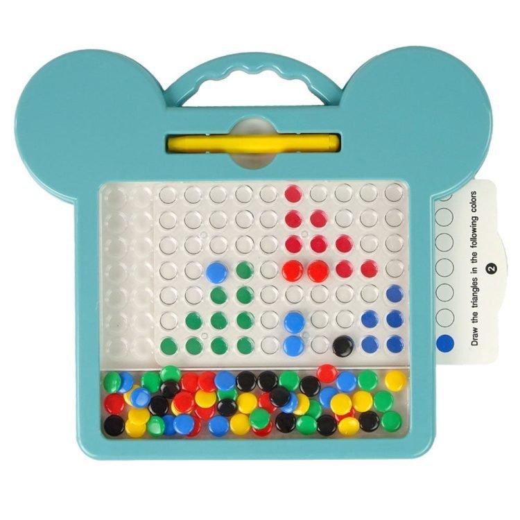Magnetic beads are placed under the surface of the screen, using the stylus try to catch one of the beads and move it to the right place on the board according to the pattern. There are cards included that show a task of sorts, simply arrange the magnets by colour and pattern. Under no circumstances should classic pens, markers or ink pens be used on the screen.