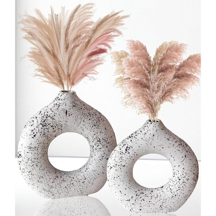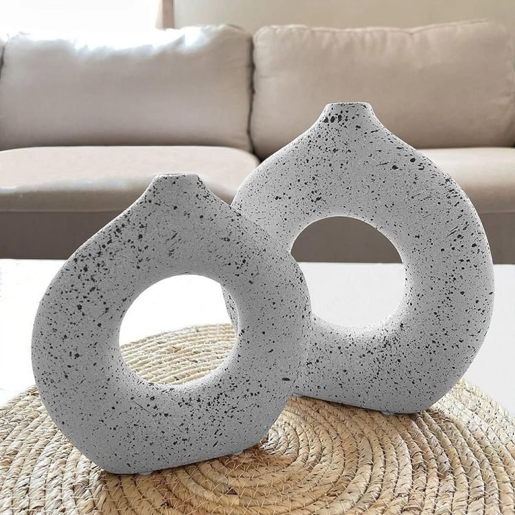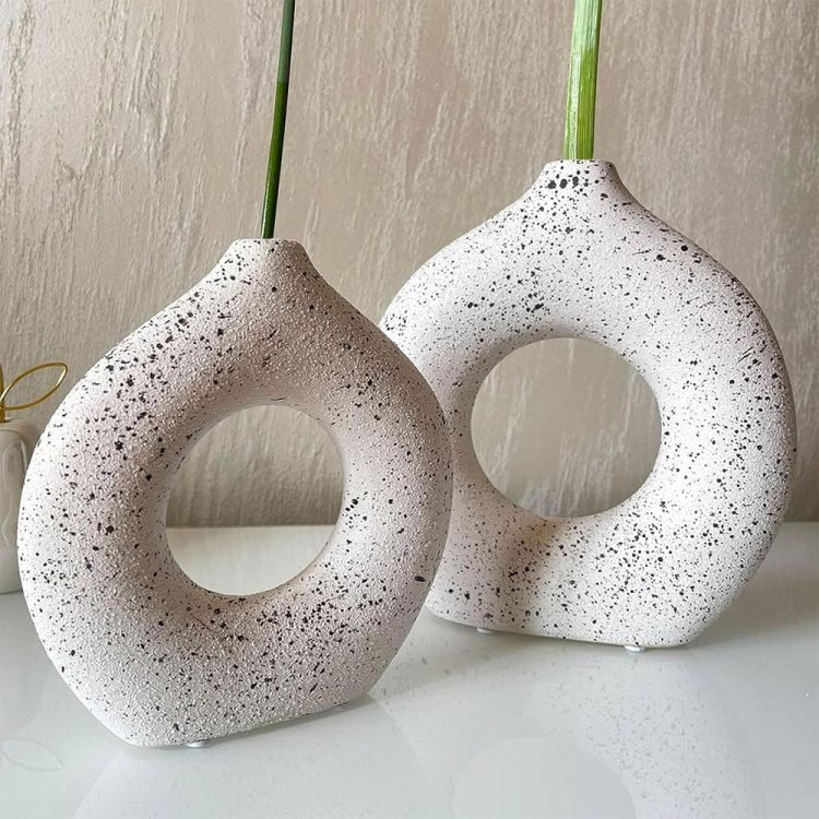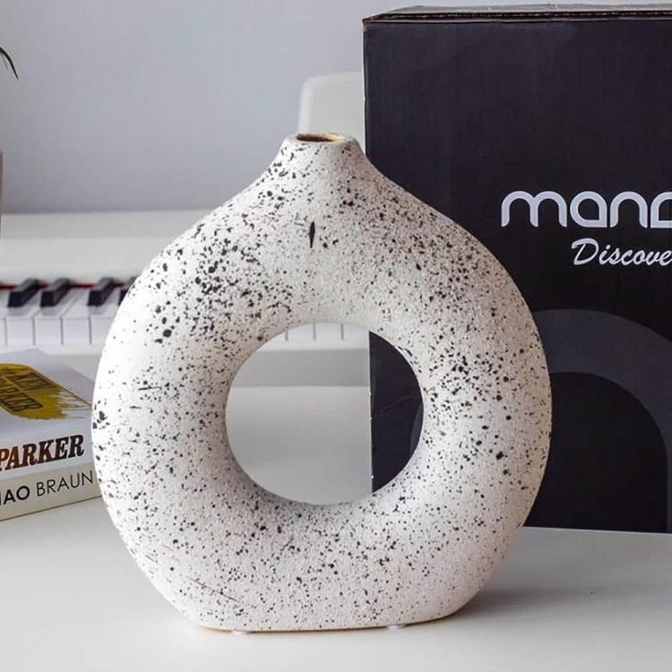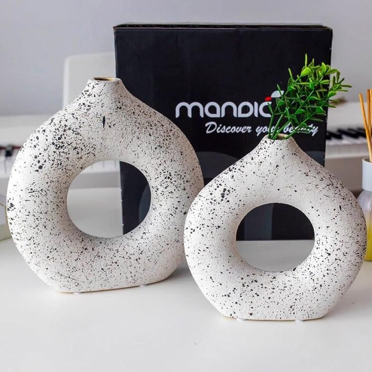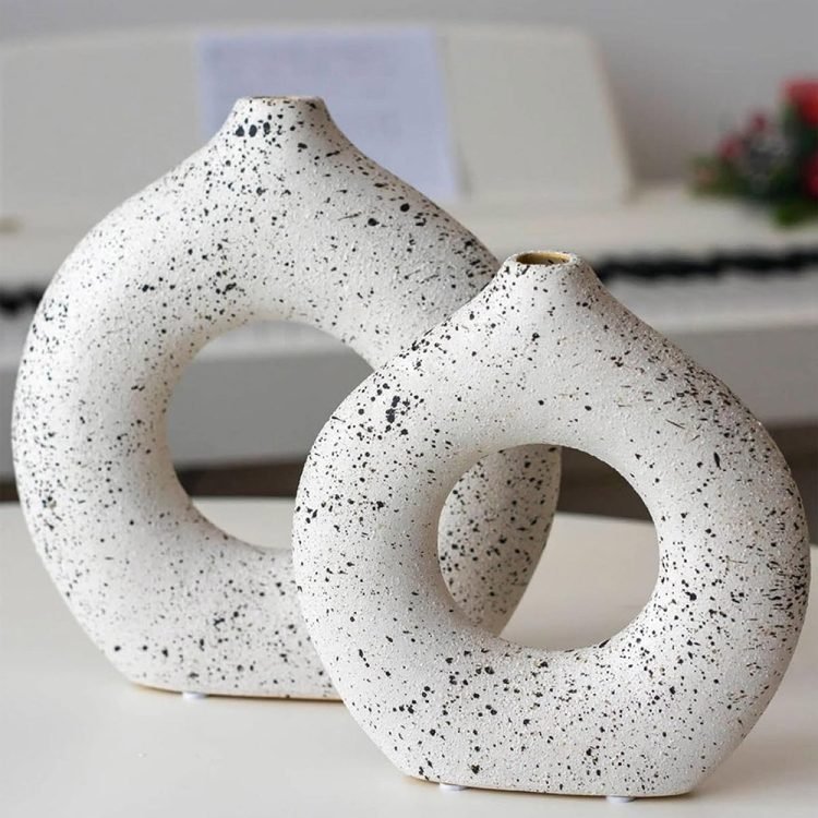 - UNIQUE MODERN DESIGN If you are tired of those dull and boring, monochromatic de-signs, you will definitely be attracted to these ceramic vases dotted with black abstracts dots on a white background. The Donut Vase boasts a unique design that will catch any customer’s eye. Its distinct shape and sleek appearance make it a stand-out piece that will add character to any home or office decor. They are not only vases, but also works of art.