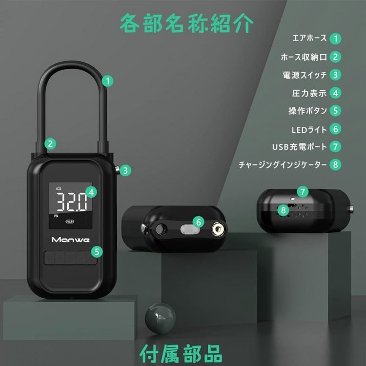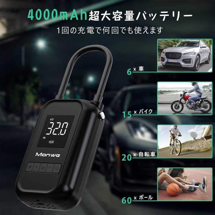 Manwe Electric Air Pump, For Bicycles, Road Bikes, Cars, Tires, Balls, Floats, Balloons, Air Compressor, Cordless Rechargeable, 4,000 mAh Large Capacity Battery, LED Light, Large Screen Display