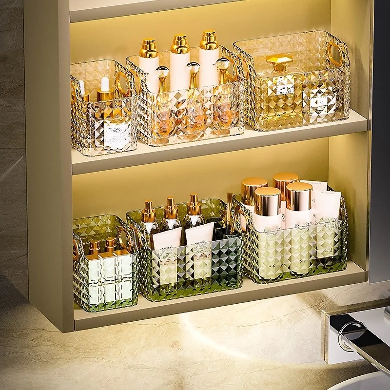 2. Design: This storage box adopts a translucent design, so you can clearly see the items in the box and find their storage location, saving the trouble of searching. There are two luxurious gold edge handles on the side, which can be moved at will.