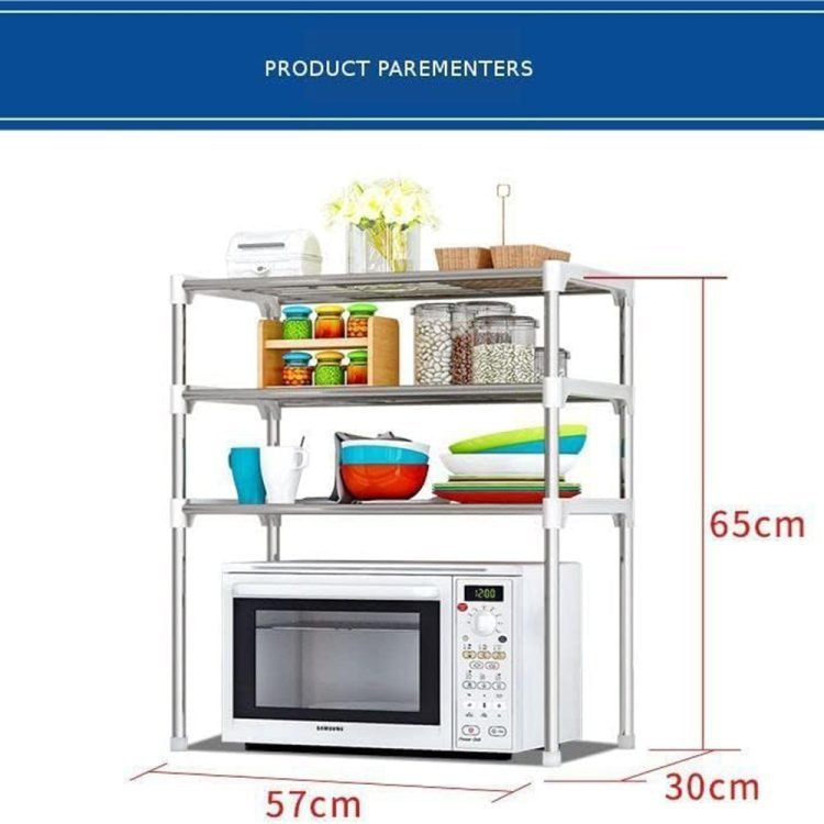 ? 201 stainless steel rack, the board can be adjusted, there are 2 files, each file can be adjusted 6cm, suitable for placing items of different heights.