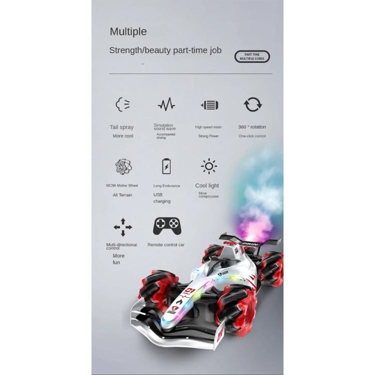 Dive into the world of F1 racing excitement! This RC car brings the speed, style, and performance of Formula racing to your fingertips. Get ready for thrilling stunts, impressive drifts, and immersive lights and sounds that make every race an exhilarating adventure.