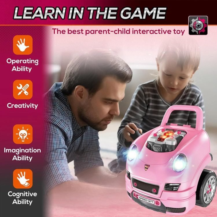 Introducing our Pink Toy Engine Truck for Kids, a car service game set that combines fun and education. This interactive engine dismantling workshop game is perfect for children aged 3+ and is designed in a delightful pink color.