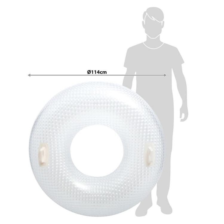 Intex Inflatable with 114?cm diameter The Wheel is made with high quality PVC for durability. With a stylish design of crystals, the wheel includes 2?extra handles. Kit of patches.