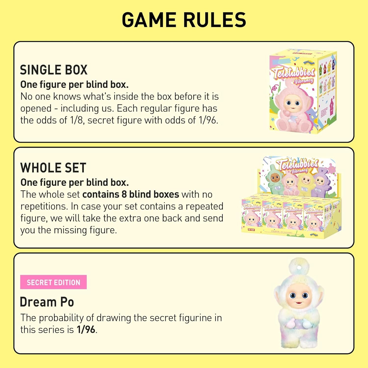 - POP MART Teletubbies Vibrancy Series Figures: The blind box contains a random figure from a specific series. Each blind box only contains one figure. No one, including us, knows what’s inside. This collection contains 8 blind box figures, one of them might be the secret edition.