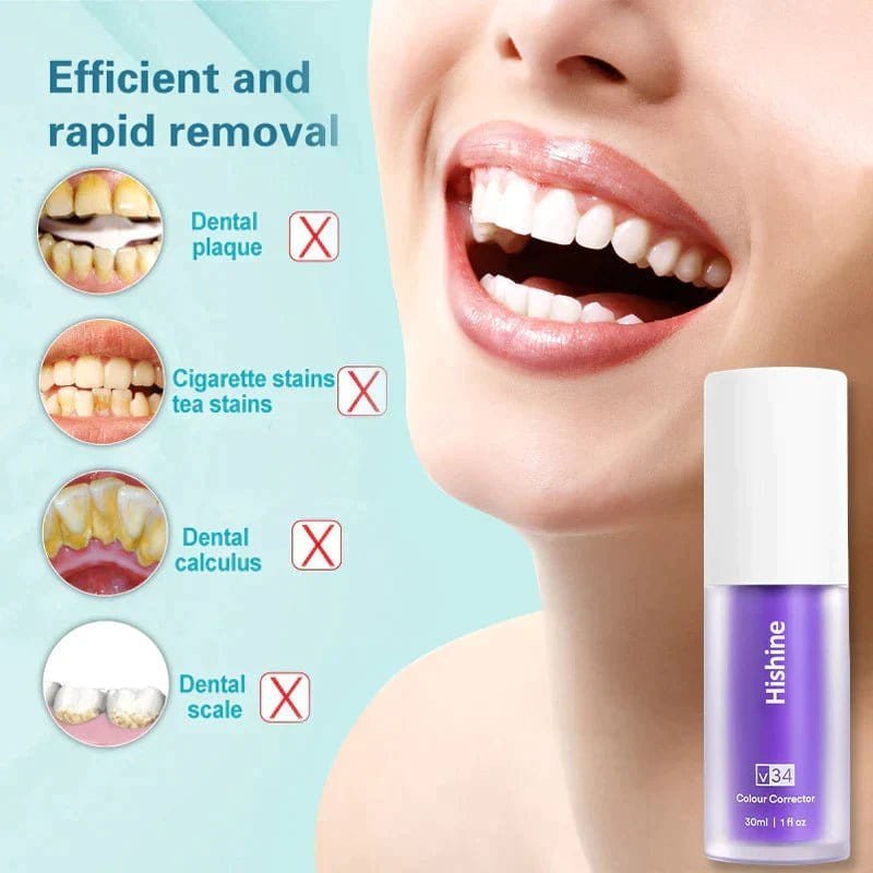 v34:?It uses color correction techniques, not chemical whitening treatments. Purple is the exact opposite of the yellow color on the color wheel and is therefore a complementary color.Applying purple to your teeth counteracts the yellow undertones, hides stains and improves shine, giving you an instant, noticeably brighter white color.