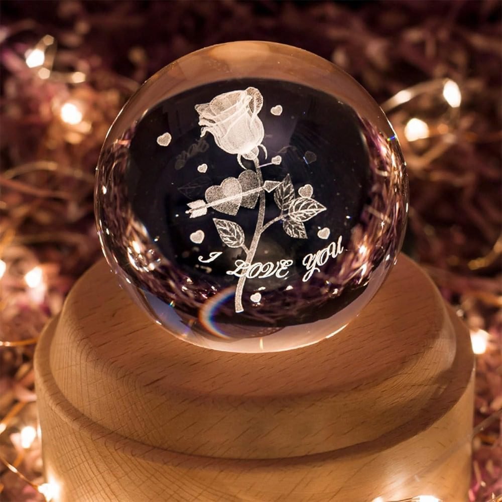• This crystal ball music box is suitable for children and adults. When the music is turned on, the crystal ball with a wooden base will rotate.