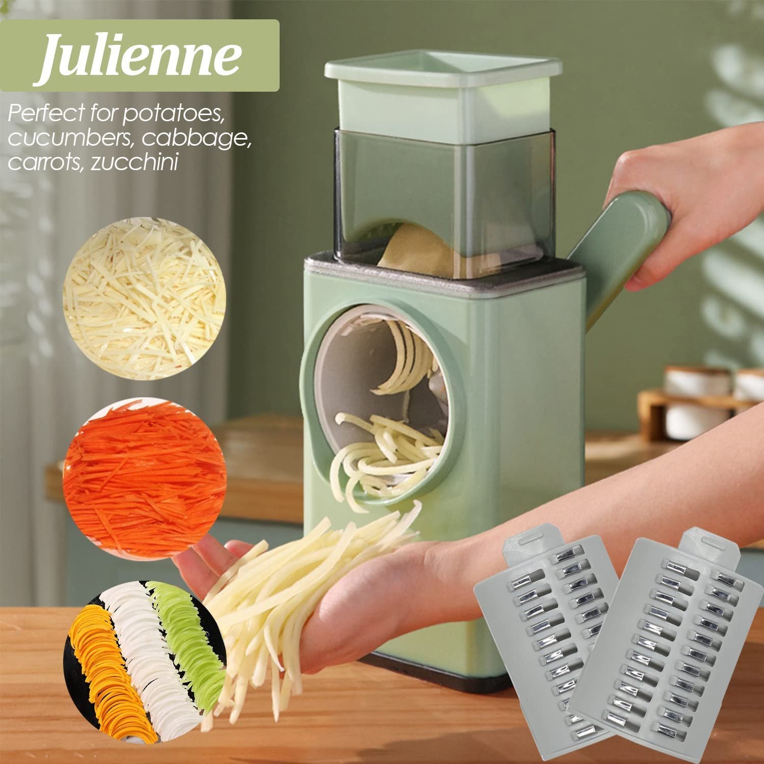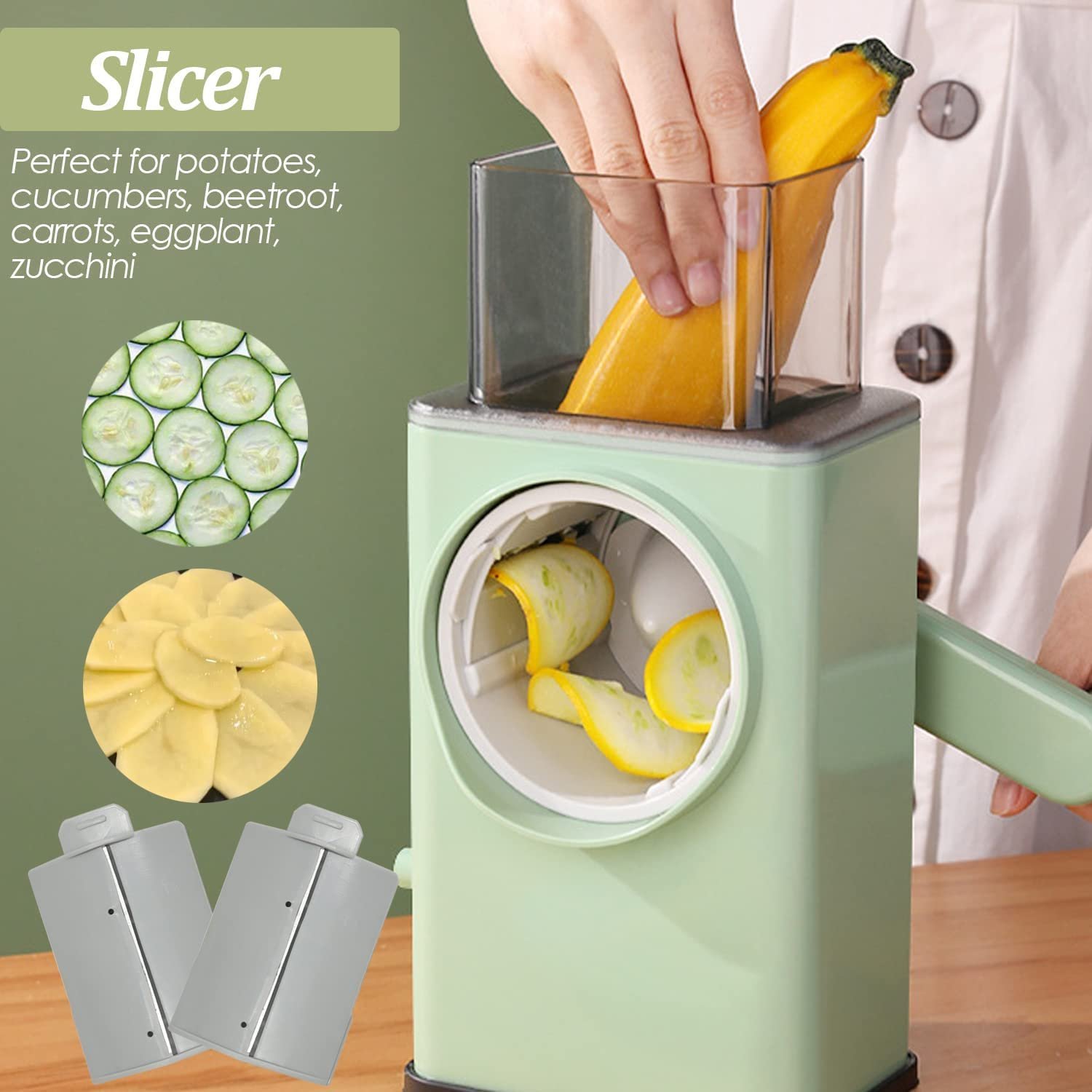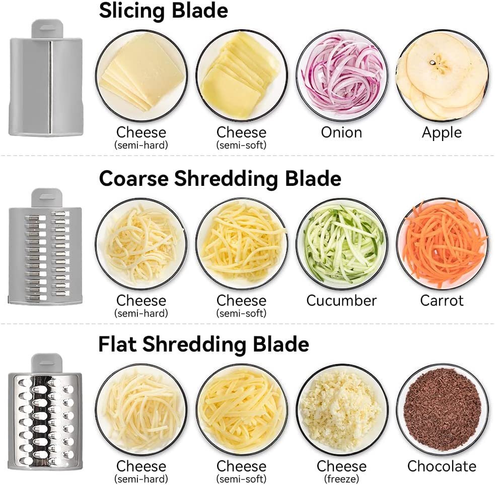 3 Interchangeable blades for cheese, potatoes, cucumbers, beetroot, carrots, cabbage, eggplant, and zucchini, also can grind biscuits, chocolate, and nuts. It’s not only a vegetable cutter but also a?cheese grater !!