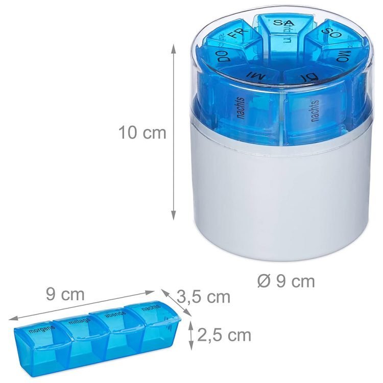 - Details: Pill box for storing medicines and vitamins – Overall dimensions H x ?: approx. 10 x 9 cm