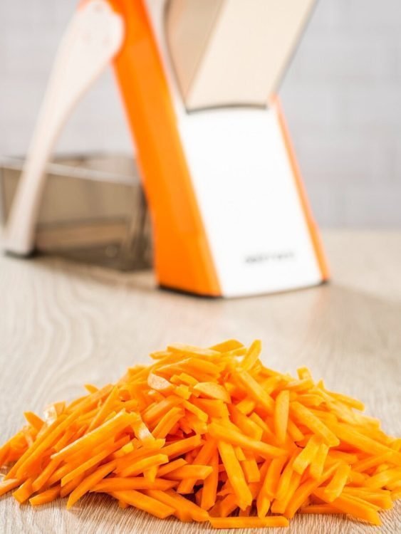 With 30+ slicing options, the mandoline cuts perfectly-even pieces from 1-8mm in thickness while also offering julienne, matchstick and dicing options. The new veggie cutter is impressive with its clean and fast cutting performance and high operating comfort and safety level, making food prep quick and easy!