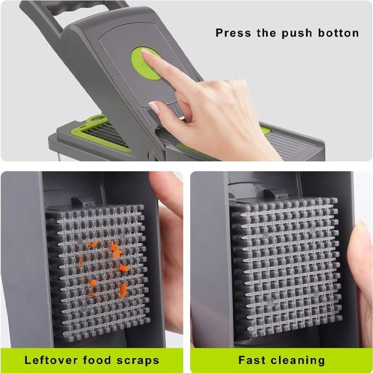 - Innovative design? Food containers free up space on the table. Use food racks when cutting small vegetables and fruits. This prevents the food from slipping off during slicing. It also makes it clean, safe and easy to use. No longer have to worry about cleaning and wiping. Remove it and put it in the dishwasher. It can be easily cleaned in a few minutes with the matching scrubbing fork. Its compact size allows you to store it almost anywhere.
