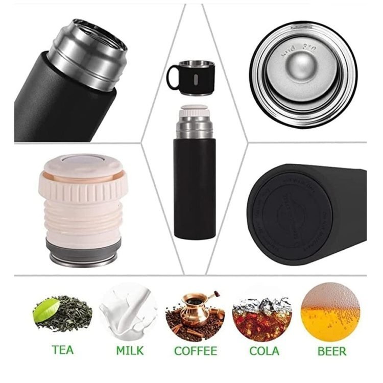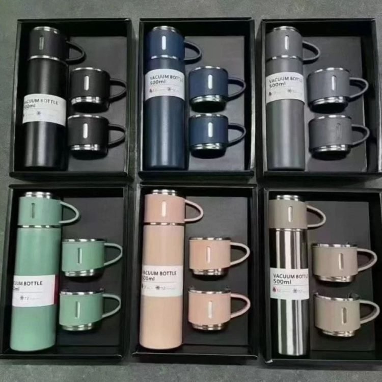 Thermos Flask Stainless Steel Vacuum Bottle Set 500 ml with 3 Drinking Cups Keeps Hot 24 Hours, Cold 24 Hours, BPA-Free with Gift Box