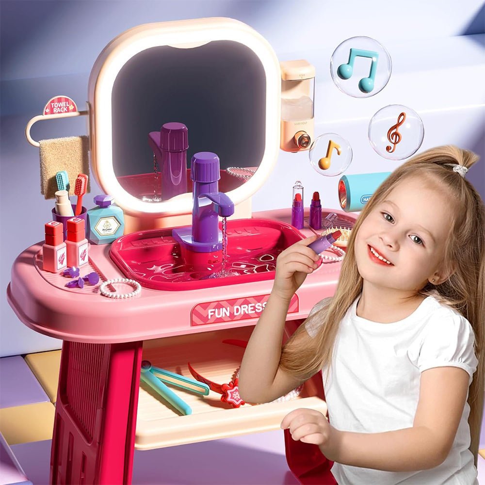 • This toddler vanity children’s game theme dressing table, real simulation scene, with Wash basin and toiletries, a full line of makeup gadgets, various modes including lighting, education, and fun mode, fully satisfies every little girls’ curiosity and princess dreams.