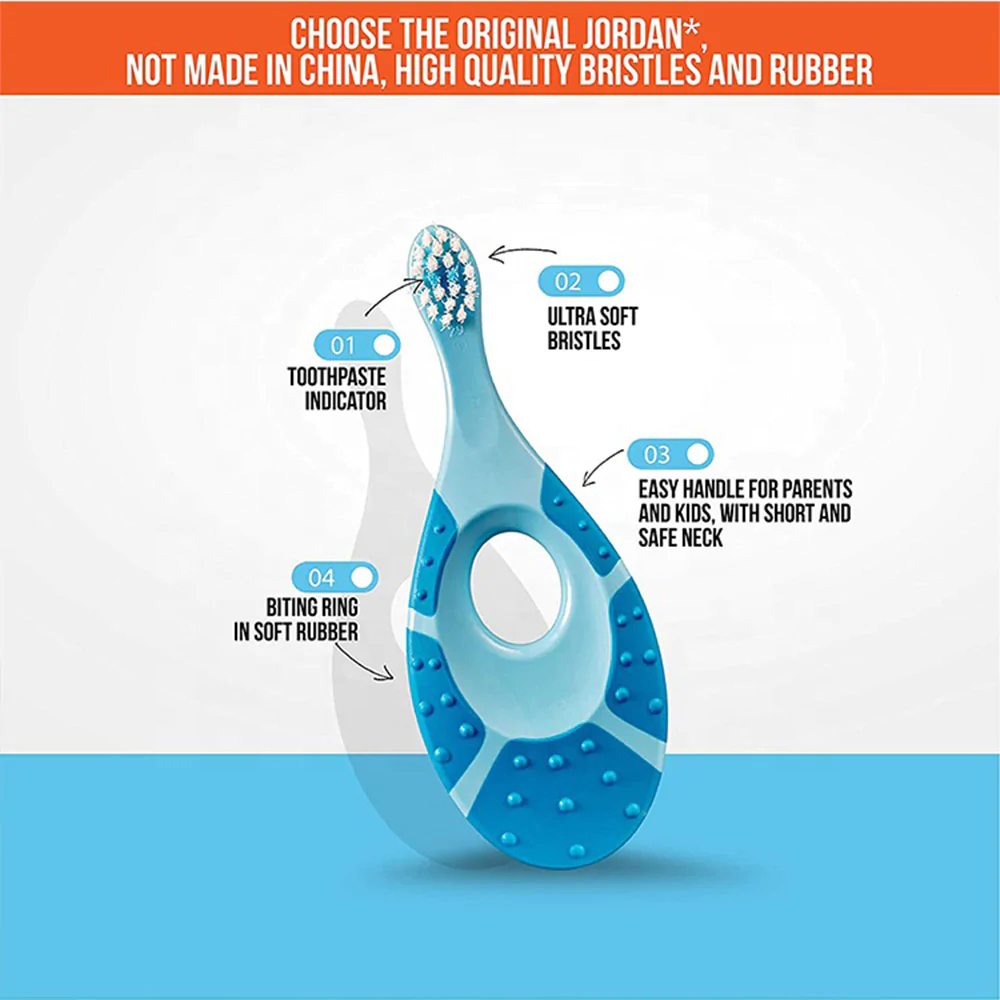 The ergonomic handle is easy to hold, suitable for babies and parents. The colored bristles indicate the amount of fluoride toothpaste used.