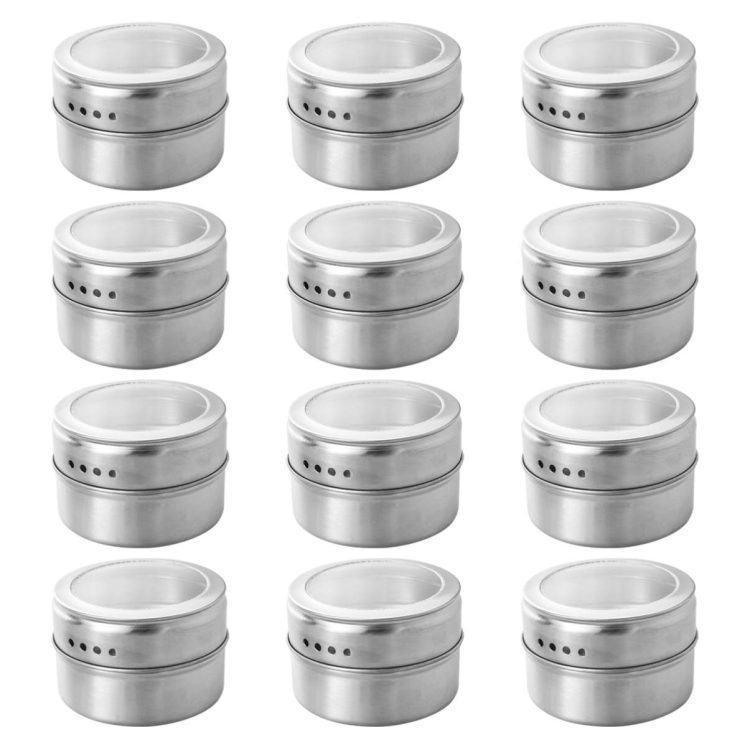 - Stainless Steel Salt and Pepper Shakers. Set of 12 units. With convenient see- through lid with magnetic backing.