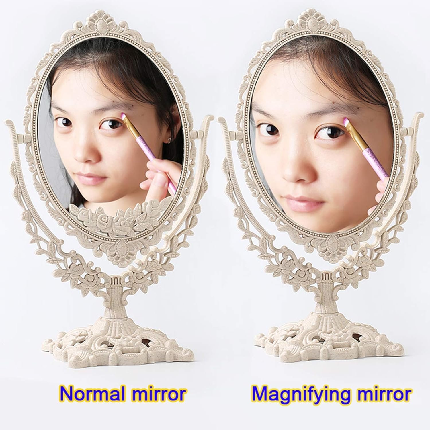 Vintage Double Sided Vanity Mirror with 1x Magnification, Removable Oval Mirror and 360° Rotation
