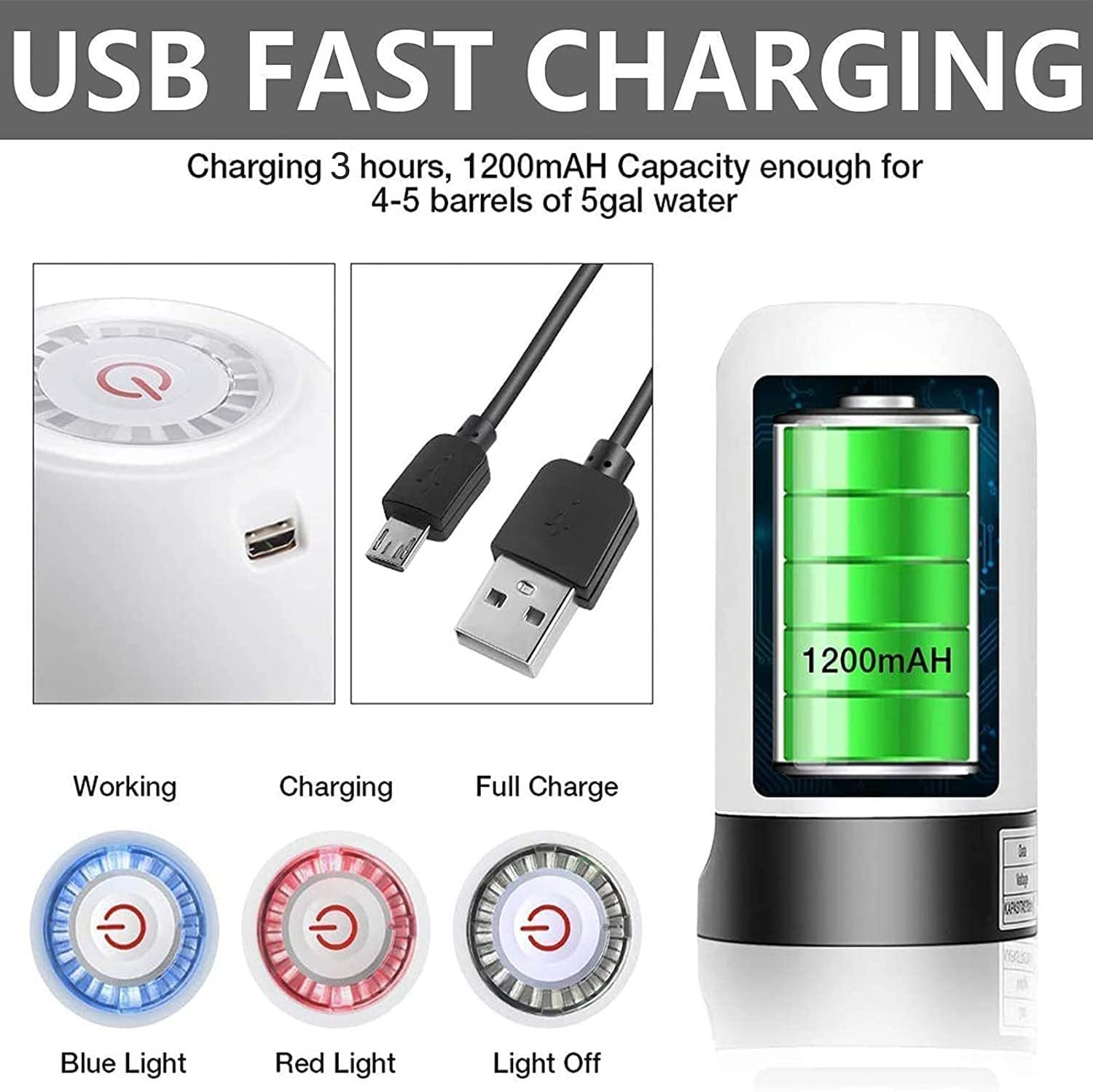 CRENTILA water bottle pump was built-in Rechargeable UL Certified 1200mAh Li-Ion battery. can be used to pump out 4-6 water jugs if fully charged.