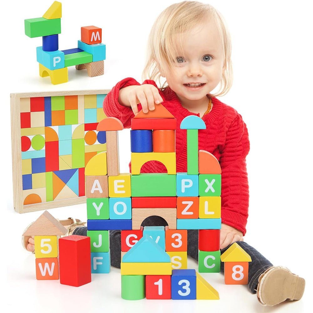 - Our block set includes 26 letter blocks (numbers on the back) and 22 building blocks.